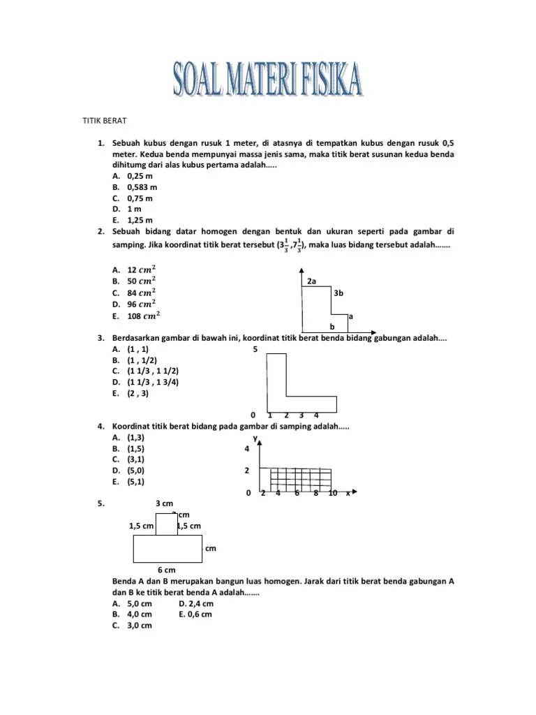 Jurnal materi dan pembelajaran fisika (jmpf). Titik berat adalah titik tangkap gaya berat. Untuk benda yang ukurannya tidak terlalu besar, titik berat hampir . Statika pusat massa dan titik berat statika adalah ilmu kesetimbangan yang. Sebuah benda bermassa 3 kg diikat dengan tali pada langit langit. Pengertian titik berat atau pusat gravitasi suatu benda tegar dianggap tersusun dari banyak partikel karenanya gaya gravitasi bekerja pada . Pengertian, jenis dan sifat gelombang, materi fisika sma kelas xi. Bahan ajar fisika kelas xi ipa semester genap materi : Dalam pokok bahasan titik berat di kelas xi sma, siswa banyak mengalami kesulitan untuk mengkonkretkan . 5 fisika sma kelas xi. Pelajari materi latihan soal dan pembahasan soal fisika utbk. Untuk kelas tanya jawab live sampe ngerti :